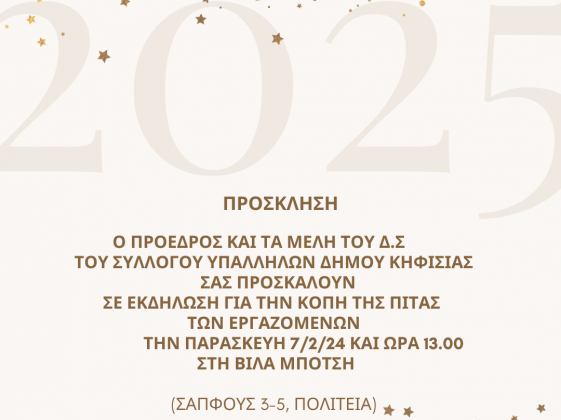Στις 7/2 η πίτα του Συλλόγου Εργαζομένων του Δήμου - Έως τις 13.00 η λειτουργία των Υπηρεσιών που εξυπηρετούν κοινό
