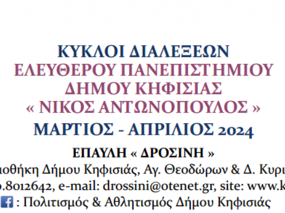 ΚΥΚΛΟΙ ΔΙΑΛΕΞΕΩΝ ΕΛΕΥΘΕΡΟΥ ΠΑΝΕΠΙΣΤΗΜΙΟΥ ΔΗΜΟΥ ΚΗΦΙΣΙΑΣ «ΝΙΚΟΣ ΑΝΤΩΝΟΠΟΥΛΟΣ» ΜΑΡΤΙΟΣ – ΑΠΡΙΛΙΟΣ 2024