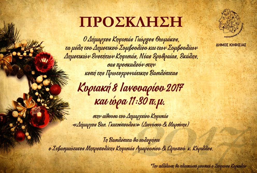 Ο Δήμαρχος Κηφισιάς Γιώργος Θωμάκος, τα μέλη του Δημοτικού Συμβουλίου και των Συμβουλίων Δημοτικών Ενοτήτων Κηφισιάς, Νέας Ερυθραίας και Εκάλης σας προσκαλούν στην κοπή της πρωτοχρονιάτικης βασιλόπιτας 2017, που θα πραγματοποιηθεί την Κυριακή 8 Ιανουαρίου 2017, στις 11:30 π.μ., στην αίθουσα του δημαρχείου Κηφισιάς «Β. Γκατσόπουλος» (Διονύσου και Μυρσίνης).