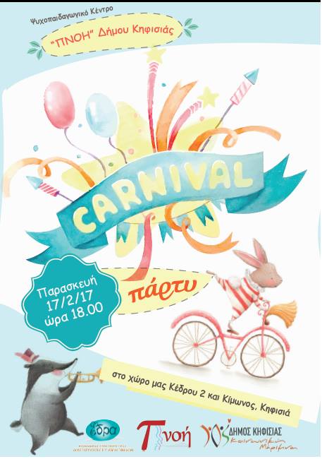 Το Ψυχοπαιδαγωγικό Κέντρο «ΠΝΟΗ» Κηφισιάς που λειτουργεί σε συνεργασία με την Κοινωνική Μέριμνα Δήμου Κηφισιάς και τον Μη Κερδοσκοπικό Οργανισμό Κ.Σ.Δ.Ε.Ο. «ΕΔΡΑ», σας προσκαλεί στην Αποκριάτικη Γιορτή των παιδιών την Παρασκευή 17 Φεβρουαρίου 2017, στις 6 μ.μ.-8 μ.μ. στο κέντρο μας, Κέδρου 2 και Κίμωνος.