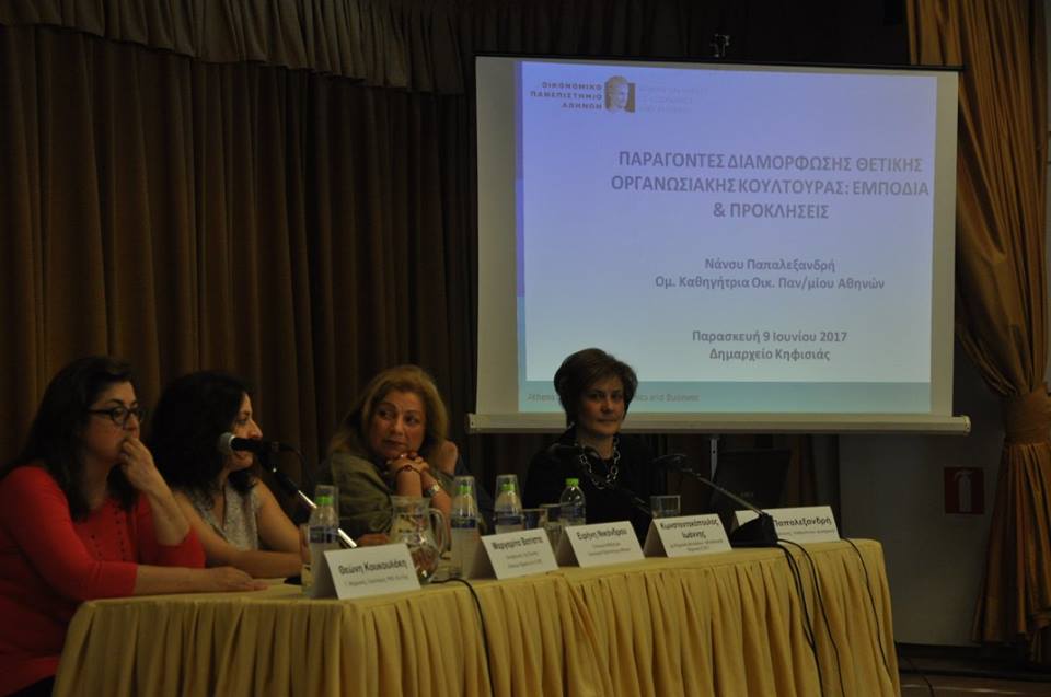 Η εκδήλωση ξεκίνησε με την ομιλία της κ.Νάνσυ Παπαλεξανδρή, ομότιμης καθηγήτριας στο Ο.Π.Α., η οποία αναφέρθηκε στην αναγκαιότητα της ανάπτυξης θετικής οργανωσιακής κουλτούρας για την εξέλιξη ενός οργανισμού, καθώς και στο σύνολο των ατομικών χαρακτηριστικών των εργαζομένων, στο στυλ ηγεσίας και στα χαρακτηριστικά της οργάνωσης που την επηρεάζουν. Στη συνέχεια μίλησε για το εργασιακό bullying , που ήδη στις ΗΠΑ έχει χαρακτηριστεί ως επιδημία που εξαπλώνεται και υπονομεύει την εργασιακή απόδοση, την εξέλιξη και την υγεία των εργαζομένων. Σε έρευνα που έγινε σε ευρωπαϊκές χώρες η Ελλάδα κατέχει την τρίτη υψηλότερη θέση με ποσοστό 13% .