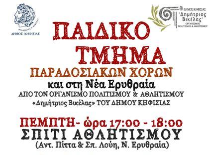 Το Παιδικό Τμήμα Παραδοσιακών Χορών Νέας Ερυθραίας δημιουργήθηκε με κύριο στόχο τη συμμετοχή των παιδιών του Καλλικρατικού Δήμου Κηφισιάς, Νέας Ερυθραίας και Εκάλης στους παραδοσιακούς χορούς του τόπου μας.