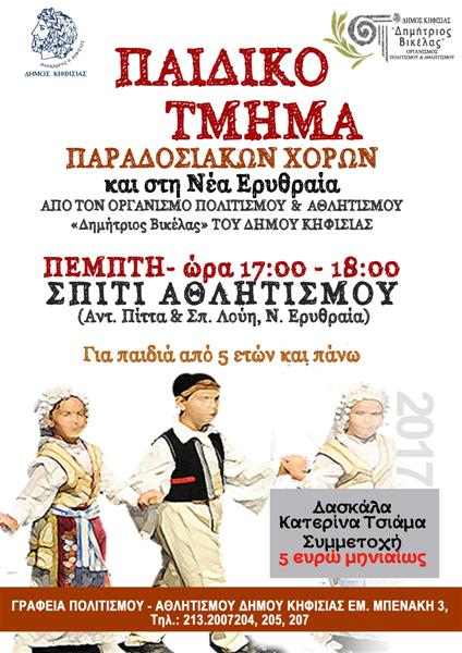 Ένα τμήμα που έχει την έδρα του στη Νέα Ερυθραία, σε έναν χώρο διδασκαλίας εύκολα προσβάσιμο για όλους τους δημότες μας και που αποσκοπεί στην βαθύτερη γνωριμία των παιδιών με την παράδοση της χώρας από μικρή ηλικία.