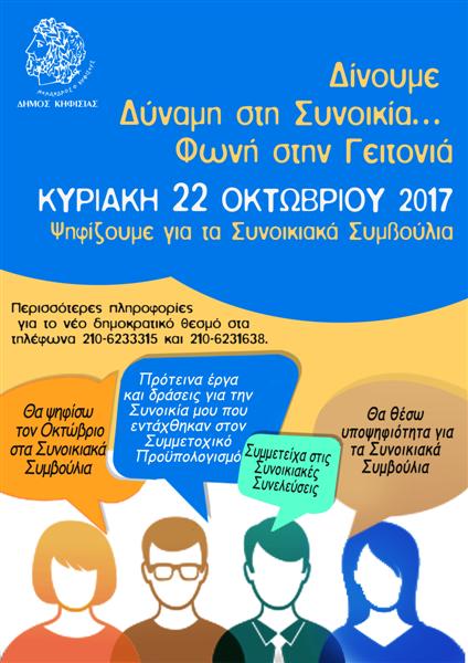 Ημερομηνία διεξαγωγής των εκλογών ορίζεται η 22α Οκτωβρίου 2017, ημέρα Κυριακή, ταυτόχρονα σε όλες τις συνοικίες του Δήμου για κάθε Συνοικιακό Συμβούλιο.