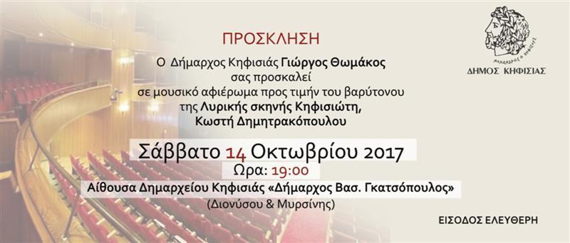 Ο Δήμος Κηφισιάς και ο Δήμαρχος Γιώργος Θωμάκος, τιμούν τον Κηφισιώτη βαρύτονο της Λυρικής Σκηνής Κωστή Δημητρακόπουλο, με μουσικό αφιέρωμα το Σάββατο 14 Οκτωβρίου 2017 και ώρα 19.00 στην Αίθουσα του Δημαρχείου Κηφισιάς «Δήμαρχος Βας. Γκατσόπουλος» (Διονύσου και Μυρσίνης).