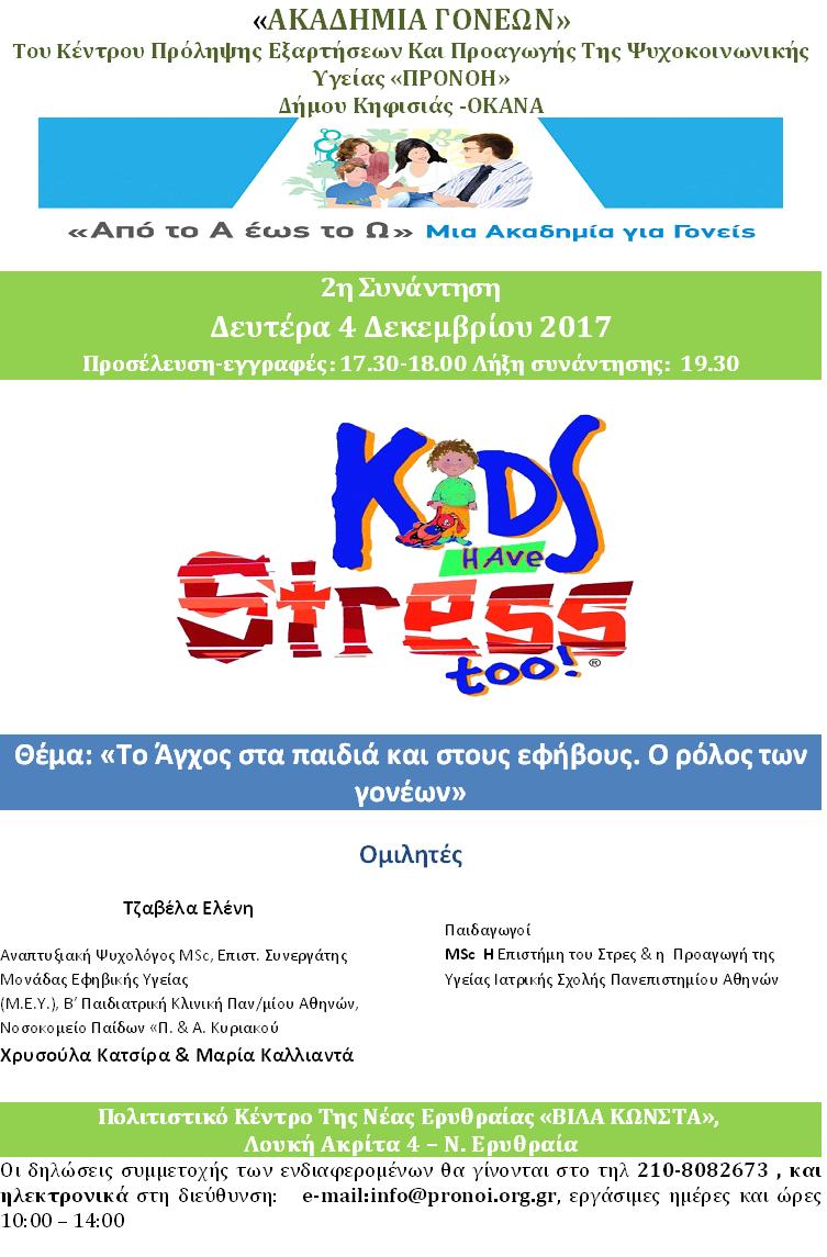 Η δεύτερη συνάντηση της «Ακαδημίας Γονέων» του Κέντρου Πρόληψης Εξαρτήσεων και Προαγωγής της Ψυχοκοινωνικής Υγείας «Προνόη» Δήμου Κηφισιάς – ΟΚΑΝΑ θα πραγματοποιηθεί τη Δευτέρα 4 Δεκεμβρίου 2017 με θέμα «Το άγχος στα παιδιά και στους εφήβους. Ο ρόλος των γονέων».