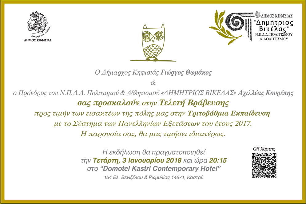 Τους πρωτοετείς φοιτητές και φοιτήτριες στην Τριτοβάθμια Εκπαίδευση βραβεύει ο Δήμος Κηφισιάς την Τετάρτη 3 Ιανουαρίου 2018 και ώρα 20.15 στο Domotel Kastri Contemporary Hotel (Ελ. Βενιζέλου και Ρωμυλίας Καστρί).
