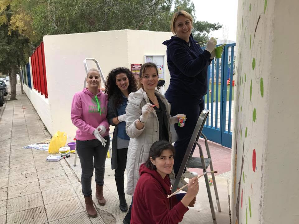 Πάνω σε σκαλωσιές με πινέλα ανά χείρας, οι μαμάδες από το 7ο και 10ο Νηπιαγωγείο Κηφισιάς μεταμορφώνουν το κτήριο, με πολύχρωμες και ευχάριστες εικόνες.