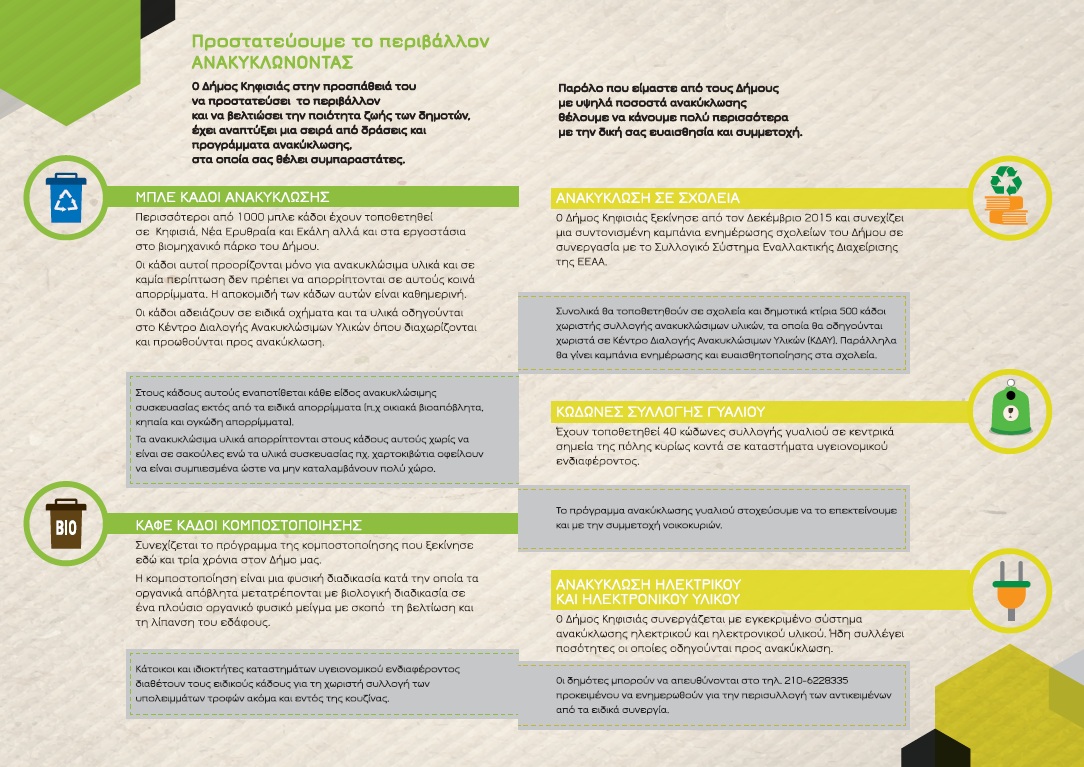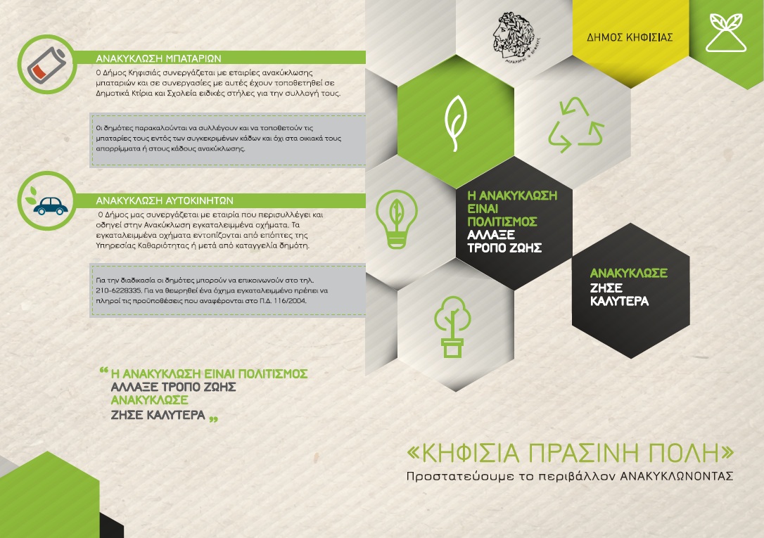 Πάνω από 5.000 φυλλάδια με τίτλο «ΚΗΦΙΣΙΑ ΠΡΑΣΙΝΗ ΠΟΛΗ», με πληροφορίες για την ανακύκλωση και τη διαχείριση των κηπαίων και ογκωδών απορριμμάτων μοιράστηκαν στους μαθητές και των 34 νηπιαγωγείων, δημοτικών, γυμνασίων και λυκείων του Δήμου Κηφισιάς, έχοντας αρωγό στην πρωτοβουλία μας την εταιρεία Executive Lease που δραστηριοποιείται στο χώρο του leasing.