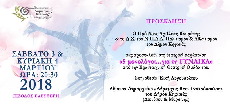 Με αφορμή του εορτασμού της «ΗΜΕΡΑΣ ΤΗΣ ΓΥΝΑΙΚΑΣ» στις 8 Μαρτίου, η Ερασιτεχνική Θεατρική Ομάδα του Ν.Π.Δ.Δ. Πολιτισμού & Αθλητισμού του Δήμου Κηφισιάς θα μας παρουσιάσει το Σάββατο 3 και την Κυριακή 4 Μαρτίου 2018, στην Αίθουσα του Δημαρχείου Κηφισιάς (Διονύσου & Μυρσίνης) κι ώρα: 20:30, τη θεατρική παράσταση «5 Μονόλογοι για τη γυναίκα…», σε σκηνοθεσία Κικής Αυγουστάτου.