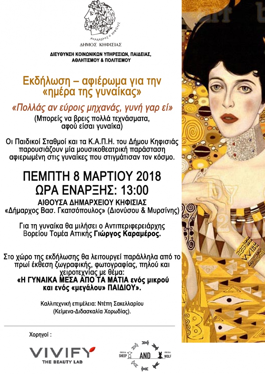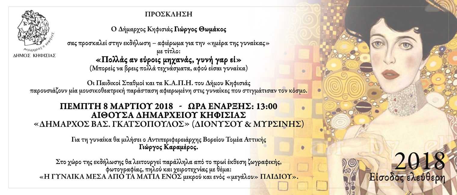 Ο Δήμαρχος Κηφισιάς Γιώργος Θωμάκος σας προσκαλεί στην εκδήλωση – αφιέρωμα για την «ημέρα της γυναίκας» με τίτλο : «πολλάς αν εύροις μηχανάς, γυνή γαρ εί»