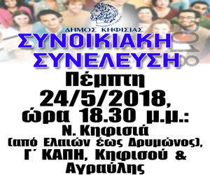 Πέμπτη 24/5/2018 και ώρα 18.30 Συνοικιακή Συνέλευση με τη συμμετοχή των κατοίκων της Νέας Κηφισιάς (από Ελαιών έως Δρυμώνος) στο Γ ΚΑΠΗ (Κηφισού και Αγραύλης).