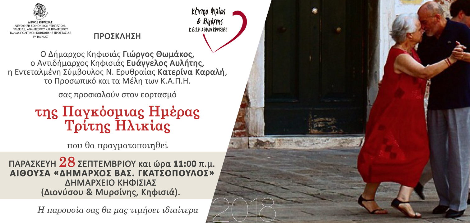 Στα πλαίσια του εορτασμού της Παγκόσμιας Ημέρας 3ης Ηλικίας ,τα ΚΑΠΗ του Δήμου μας σας καλούν να παρευρεθείτε: