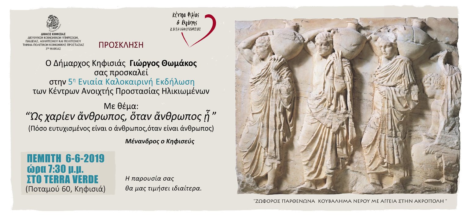 Την Πέμπτη 6 Ιουνίου θα πραγματοποιηθεί η μεγάλη γιορτή των ΚΑΠΗ του Δήμου Κηφισιάς στο Terra Verde. H εκδήλωση θα ξεκινήσει στις 7.30 με ένα πλούσιο πρόγραμμα.