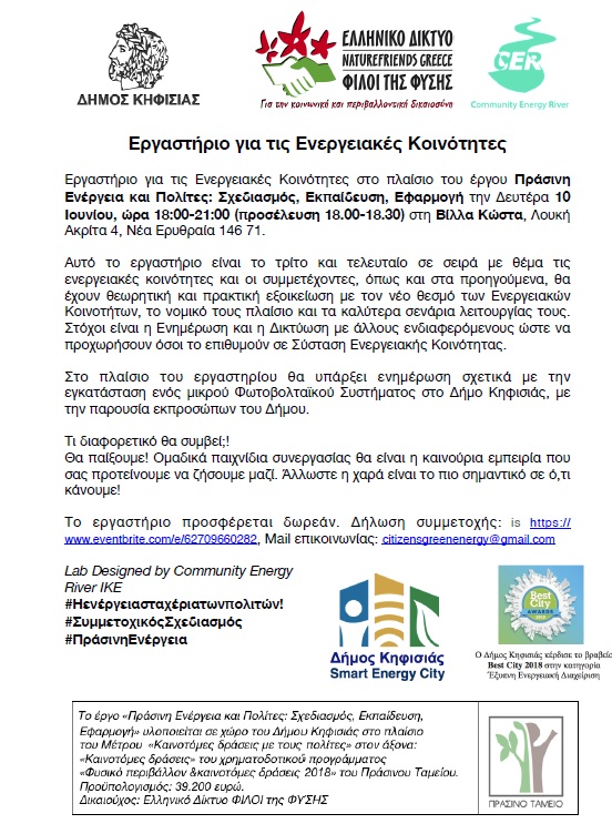 Εργαστήριο για τις Ενεργειακές Κοινότητες στο πλαίσιο του έργου "Πράσινη Ενέργεια και Πολίτες : Σχεδιασμός , Εκπαίδευση ,Εφαρμογή ".