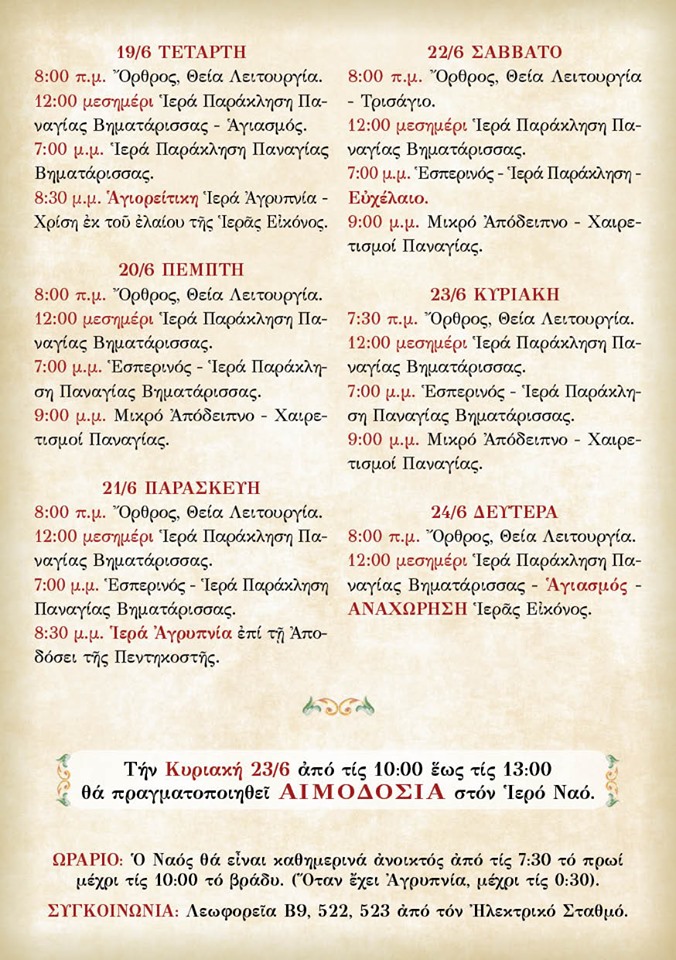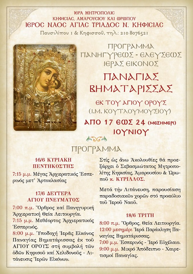 Τη Δευτέρα 17 Ιουνίου 2019, εορτή του Αγίου Πνεύματος, η Νέα Κηφισιά και ο Πανηγυρίζων Ενοριακός Ναός της Αγίας Τριάδος, θα έχουν την ιδιαίτερη τιμή και ευλογία να υποδεχθούν και να φιλοξενήσουν μέχρι τις 24 Ιουνίου, την Θαυματουργή εικόνα της Παναγίας της Βηματάρισσας, προερχόμενη από την Ιερά Μονή Κουτλουμουσίου του Αγίου Όρους.