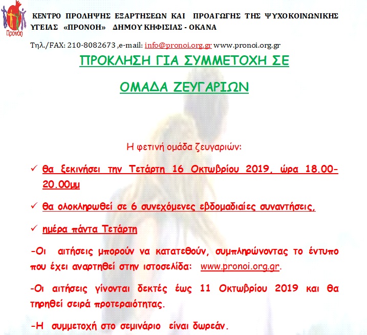 Η φετινή ομάδα ζευγαριών θα ξεκινήσει την Τετάρτη 16 Οκτωβρίου 2019, ώρα 18.00-20.00μμ και θα ολοκληρωθεί σε 6 συνεχόμενες εβδομαδιαίες συναντήσεις. Ημέρα πάντα Τετάρτη και θα μπορούν να συμμετέχουν από 3 έως 6 ζευγάρια για λόγους ποιοτικής διασφάλισης της ομάδας.