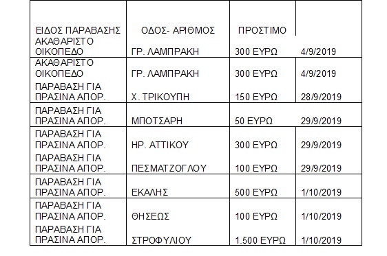 Δείτε στον πίνακα που ακολουθεί τα πρόστιμα που επιβλήθηκαν τους μήνες Σεπτέμβριος- Οκτώβριος- Νοέμβριος 2019.