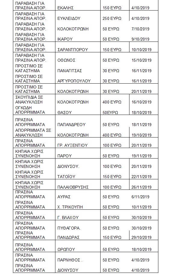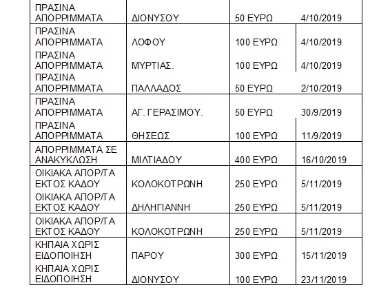 Το ποσό των προστίμων την συγκεκριμένη χρονική περίοδο είναι περίπου 8.000 ευρώ και η πλειοψηφία τους αφορά σε παραβάσεις που σχετίζονται με πράσινα απορρίμματα.