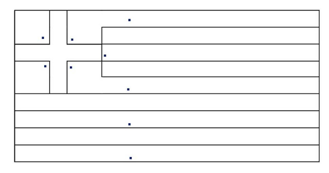 Βάφουν με μπλε χρώμα τα σημεία στα οποία υπάρχουν τελείες. Εναλλακτικά, με γκοφρέ χαρτί τα παιδιά κάνουν μπαλάκια (που τους αρέσει τόσο πολύ) και τα κολλάνε αντί να τη ζωγραφίσουν. Τέλος, εάν επιθυμείτε. Μπορείτε να κόψετε τη σημαία που φτιάξατε και να την κολλήσετε σε ένα καλαμάκι ή ένα γλωσσοπίεστρο ή ένα καλαμάκι από σουβλάκι.