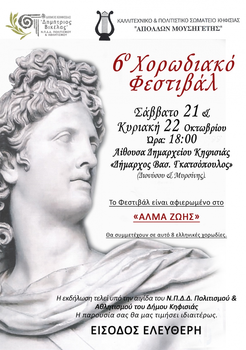 Το Σάββατο 21 και την Κυριακή 22 Οκτωβρίου 2017 θα πραγματοποιηθεί 6ο Χορωδιακό Φεστιβάλ του Καλλιτεχνικού και Πολιτιστικού Σωματείου Κηφισιάς «Απόλλων Μουσηγέτης» στην Αίθουσα Δημαρχείου Κηφισιάς «Δήμαρχος Βασ Γκατσόπουλος» (Διονύσου και Μυρσίνης).