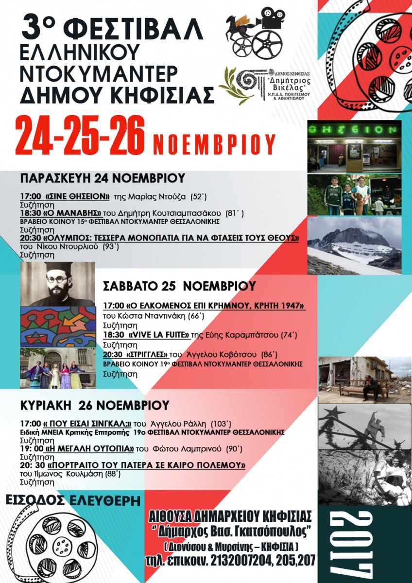 Για 3η συνεχή χρονιά το Ν.Π.Δ.Δ. Πολιτισμού & Αθλητισμού του Δήμου Κηφισιάς διοργανώνει το Φεστιβάλ Ελληνικού Ντοκυμαντέρ του Δήμου μας, το οποίο θα πραγματοποιηθεί στην Αίθουσα του Δημαρχείου Κηφισιάς «Δήμαρχος Βασ. Γκατσόπουλος», από την Παρασκευή 24 Νοεμβρίου έως και την Κυριακή 26 Νοεμβρίου 2017.