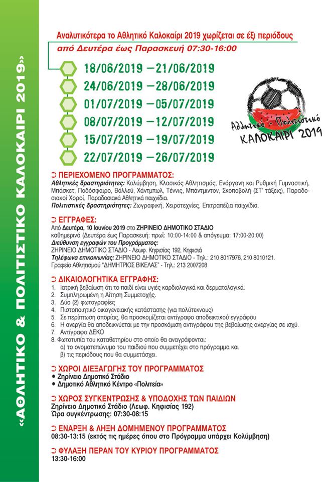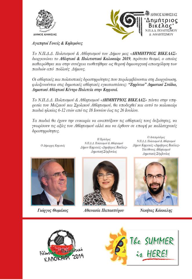 Το Ν.Π.Δ.Δ. Πολιτισμού & Αθλητισμού του Δήμου μας «ΔΗΜΗΤΡΙΟΣ ΒΙΚΕΛΑΣ» διοργανώνει το Αθλητικό & Πολιτιστικό Καλοκαίρι 2019,πρότυπο θεσμό, ο οποίος καθιερώθηκε και στην συνέχεια υιοθετήθηκε ως θερινή δημιουργική απασχόληση των παιδιών από πολλούς Δήμους.