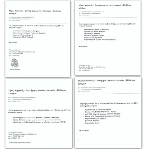 Ο Δήμος Κηφισιάς ανταποκρίθηκε στο αίτημα του ΔΕΔΔΗΕ και απέστειλε περίπου 200 έγγραφα αιτήματα για κλαδέματα δέντρων πλησίον ηλεκτροφόρων καλωδίων, μέσα στο 2020. Ενδεικτικά και προκειμένου να μην υπάρξει καμία αμφισβήτηση επισυνάπτουμε 20 παραγγελίες της Διεύθυνσης Πρασίνου του Δήμου μας που δεν απαντήθηκαν.