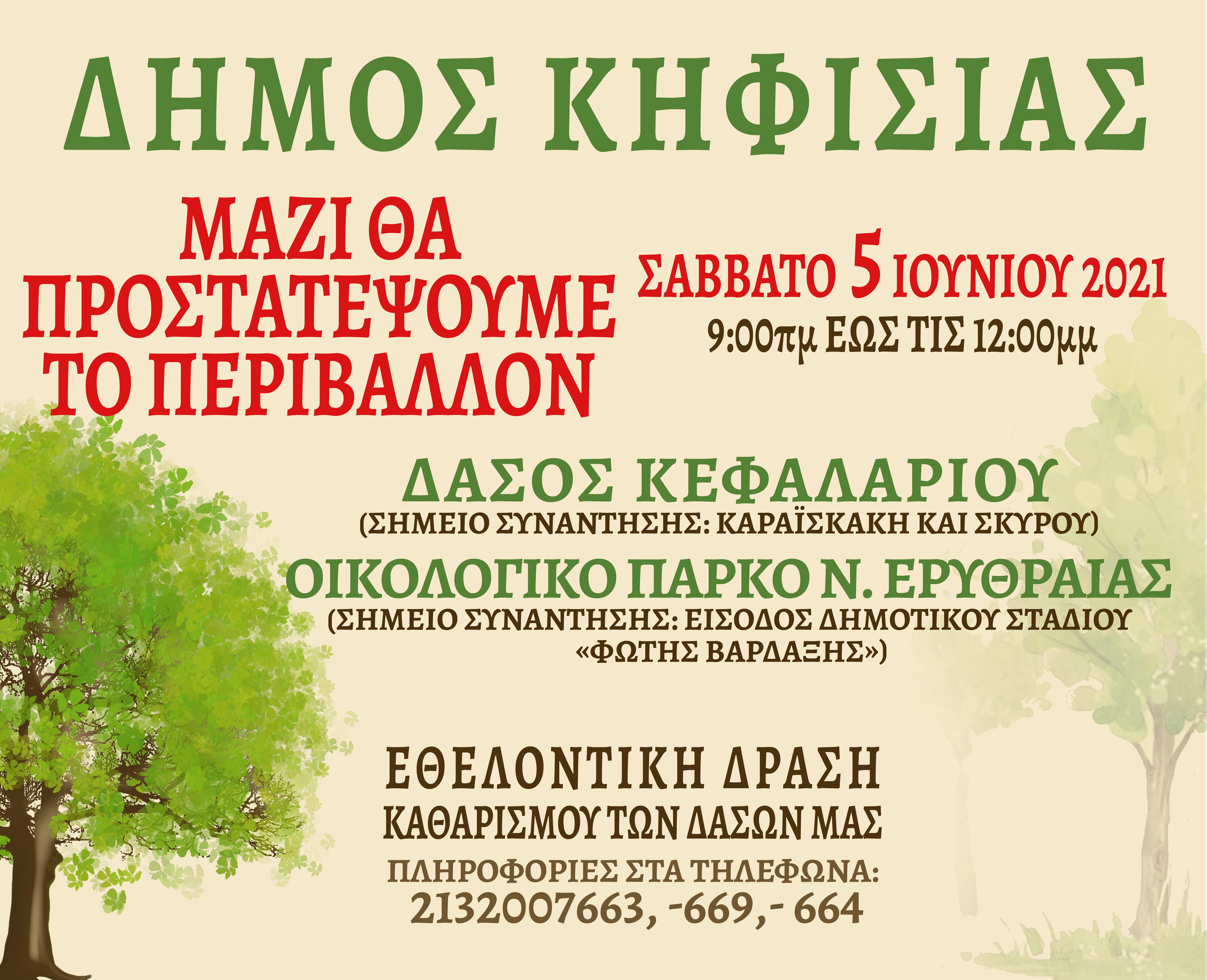 Δράση εθελοντικού καθαρισμού στα δάση του Κεφαλαρίου και του Οικολογικού Πάρκου Νέας Ερυθραίας οργανώνουν ο Δήμος Κηφισιάς και το Γραφείο Εθελοντισμού του Δήμου μας, το Σάββατο 5 Ιουνίου 2021, στο πλαίσιο του εορτασμού της Παγκόσμιας Ημέρας Περιβάλλοντος.