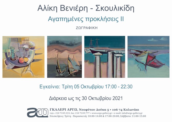 H Κηφισιώτισσα καταξιωμένη ζωγράφος κ. Αλίκη Βενιέρη -Σκουλικίδη εκθέτει τις τελευταίες της δημιουργίες ¨ΑΓΑΠΗΜΕΝΕΣ ΠΡΟΚΛΗΣΕΙΣ ΙΙ¨ στη Γκαλερί ΑΡΓΩ, Νεοφύτου Δούκα 5, στο Κολωνάκι, 5-30 Οκτωβρίου 2021. Tα εγκαίνια της Έκθεσης θα πραγματοποιηθούν την Τρίτη 5 Οκτωβρίου, 17.30-22.00 μμ. Μέρος της έργων της Έκθεσης είχαν εκτεθεί στο Αίθριο του Δημαρχείου Κηφισιάς στις 24/06/2021 στο πλαίσιο των εκδηλώσεων του Δήμου για τα 200 Χρόνια Εθνικής Παλιγγενεσίας.