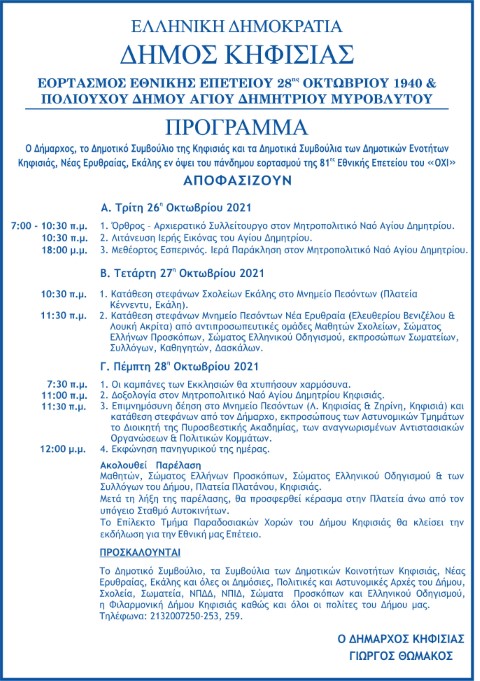Ο Δήμος Κηφισιάς γιορτάζει με κάθε επισημότητα την επέτειο της 28ης Οκτωβρίου. Οι επετειακές εκδηλώσεις θα κορυφωθούν ανήμερα της Εθνικής Εορτής με την τελετή Δοξολογίας στον Μητροπολιτικό Ναό Αγίου Δημητρίου, την επιμνημόσυνη δέηση στο Μνημείο Πεσόντων στην Κηφισιά και τη μαθητική παρέλαση.