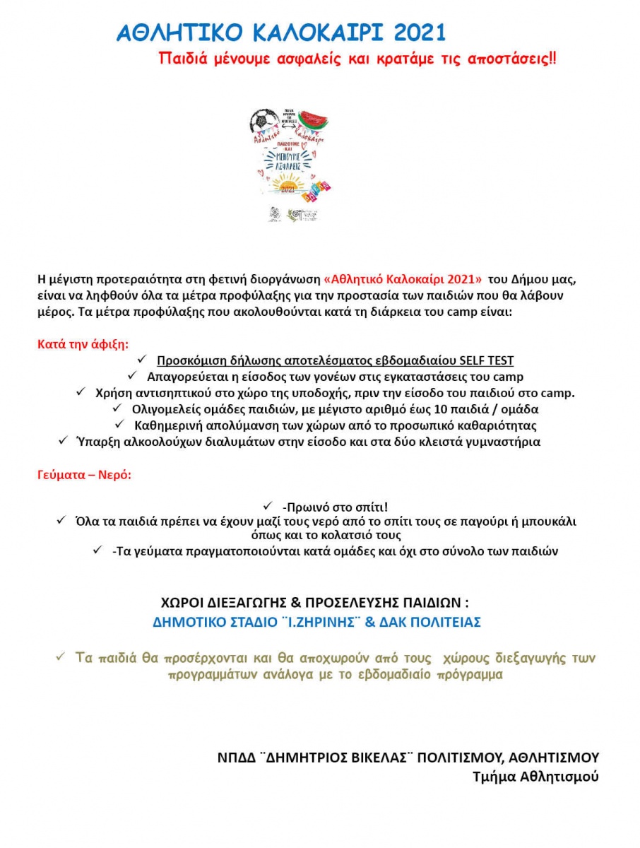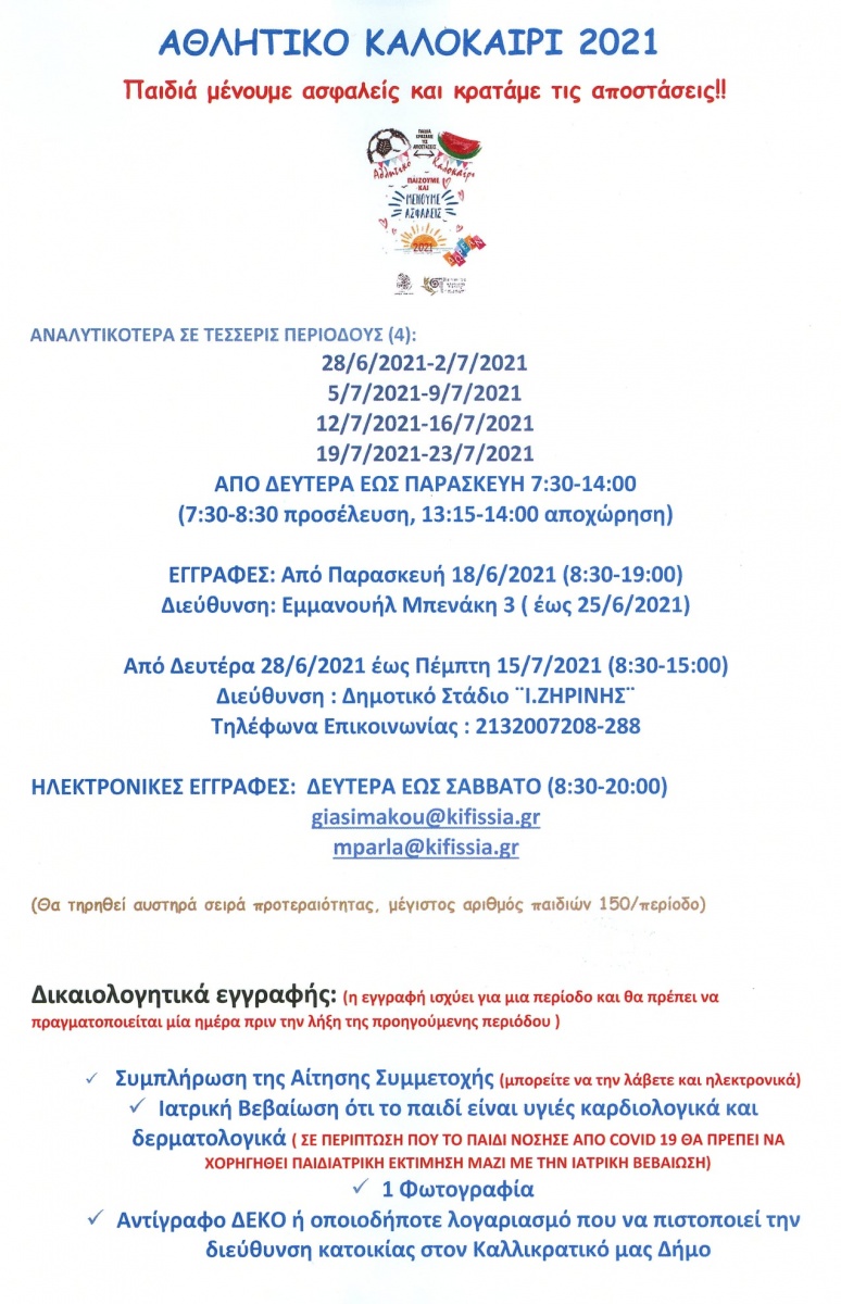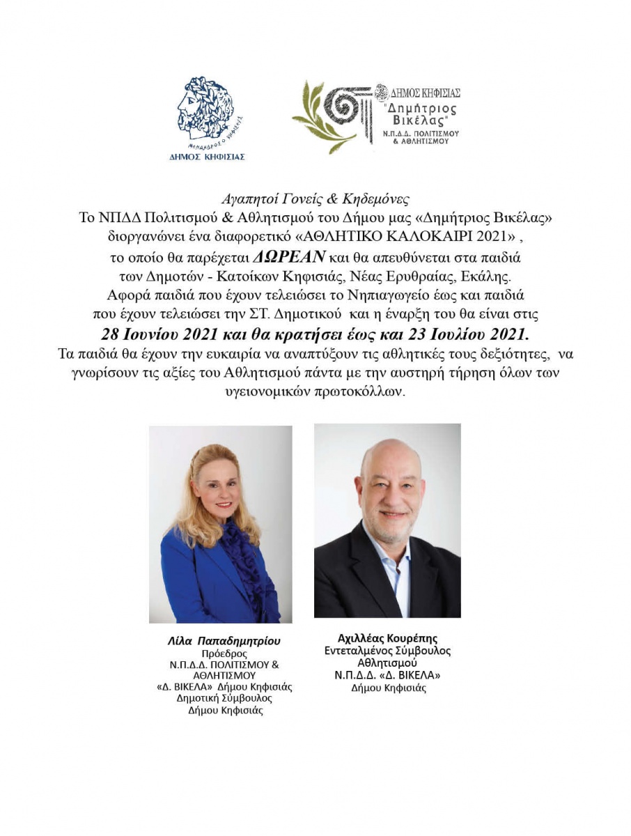 Το Αθλητικό Καλοκαίρι 2021 θα παρέχεται δωρεάν και θα απευθύνεται σε παιδιά των Δημοτών - Κατοίκων Κηφισιάς , Νέας Ερυθραίας και Εκάλης.