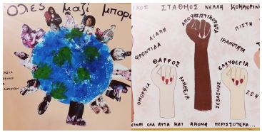 Οι ζωγραφιές των παιδιών προέκυψαν μέσα από βιωματικές δραστηριότητες (συζήτηση, ανάγνωση παραμυθιού, δραματοποίηση, χορός, κουκλοθέατρο, εικαστικές δημιουργίες) με θέμα το σεβασμό στη γυναίκα αλλά και τον άνθρωπο.