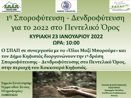 Ο Σύνδεσμος για την Προστασία και Ανάπλαση του Πεντελικού (ΣΠΑΠ) σε συνεργασία με το «Όλοι Μαζί Μπορούμε και στο Περιβάλλον» και τον Δήμο Κηφισιάς διοργανώνει την 1η δράση Αναδάσωσης που θα πραγματοποιηθεί την Κυριακή 23 Ιανουαρίου 2022 στις 10 π.μ. στην περιοχή του Κοκκιναρά.